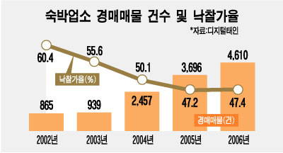 부동산 경매정보업체 디지털태인에 따르면 경매 매물로 나온 여관·모텔 등 숙박업체수는 지난 2002년 865건에서 2003년 939건, 2004년 2457건, 2005년 3696건으로 증가한데 이어 지난해에는 4610건으로 사상 최고치를 기록했다.