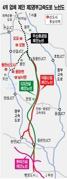 두산중공업 GS건설 건설업체가 각각 제안한 수도권 제2경부축은 외곽순환도로 서하남나들목(IC)에서 출발해 용인, 안성을 거쳐 행정중심복합도시로 연결되는 노선 구조다.