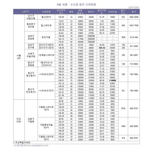 11일 부동산정보업체 스피드뱅크에 따르면 8월 입주하는 서울을 포함한 수도권 아파트 프리미엄을 조사한 결과, 용산구 한강로 용산동5가 시티파크2단지 238.01m²(72평형)가 분양가 12억5000만원에 11억원의 웃돈이 붙은 것으로 나타났다.