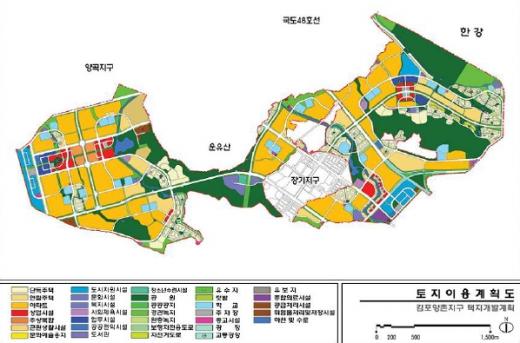 신도시 중앙을 흐르는 폭 20m 연장 3.1km의 김포대수로 주변을 중심으로 생태환경지구, 문화교류지구, 복합업무지구로 구분된다.