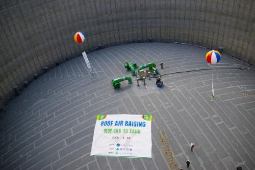 이날 행사는 LNG 저장탱크 내부 바닥에서 제작·조립한 지붕덮개를 송풍기를 통해 밀폐된 내부공간에 공기를 공급, 공기의 압력만으로 약 970톤의 지붕을 탱크 상부에 설치하는 작업이다.