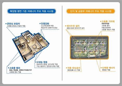 이번 에너지 절약형 아파트는 지난 4년간의 연구개발을 통해 축적된 핵심 기술로 지어진다. 신소재 단열재 및 고성능 콘덴싱보일러, 3중유리 시스템 등이 적용된다. 단지 내 모든 가로등에는 신재생 에너지인 태양광 발전시스템이 적용되고 집안과 주차장에는 고효율 전기시설이 갖춰져 전기소모량이 절감된다.
