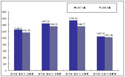 부동산 114에 따르면 용인 성복동의 경우 6월 현재 3.3㎡당 평균 매매가는 1349만원으로 지난해 1월보다 89만원이 더 떨어졌다. 광교신도시와 맞붙어 있는 용인 상현동과 수원 영통지구도 각각 1161만원, 1015만원으로 하락했다. 이들 지역의 아파트가 대부분 중대형 위주로 구성돼 있다는 점을 감안하면 광교신도시 분양가가 더 비싸지는 셈이다.