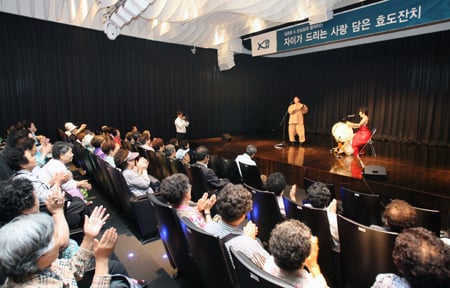 GS건설의 부산 연산동 '자이갤러리'는 연제구청과 함께 인근 독거노인 150명을 초청해 지난 26일 효도잔치 공연을 개최했다고 28일 밝혔다. 이날 행사에는 김준호·손심심 부부의 국악공연이 열려 참석자들의 큰 호응을 얻었으며, '사랑의 선물' 전달 행사도 이어졌다. 최형돈 연산 자이갤러리 관리소장은 "앞으로도 독거노인 뿐 아니라 소년소녀가장 등 우리사회에서 소외받는 이들을 위한 행사와 봉사 활동을 지속적으로 해 나갈 계획"이라고 말했다. 독자들의 PICK! "몇 명이랑 잤나 세어 보자" 장항준 19금 발언 파묘 "사랑해, 뽀뽀 쪽" 은퇴한 남편 녹음파일, 딸 결혼 앞두고 지인 13세 딸 성폭행 살해한 살인범 "동거녀 시체 안고 자" "딸 최진실 통장에 15억, 건물도 환희·준희에"...母, 유산 300억설 반박