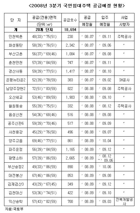 국토해양부는 올 3분기 중 국민임대주택 1만8694가구의 입주자를 모집할 예정이라고 30일 밝혔다.