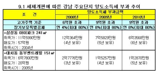 최초 분양가 6억7800만원으로, 지난 2005년 2월 입주한 시가 20억원의 대치동 '동부센트레빌' 151㎡(전용 121㎡) 양도세는 올해 2억7776만원에서 내년엔 1억5257만원으로, 2010년에는 1억2870만원으로 각각 줄어든다.