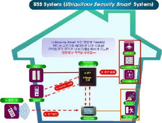 USS 시스템은 외부에서 아파트 현관에 구멍을 뚫거나 우유 투입구 등을 통해 도어록을 열어 침입하는 행위를 불가능하게 하는 유비쿼터스 보안 시스템(U-Security Smart System) 기을 제공한다.