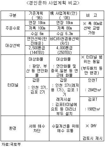 ◇바다·강 겸용 4000t급 선박 운항= 국토부가 확정한 사업계획에 따르면 경인운하를 운항하는 선박은 바다와 강을 모두 다닐 수 있는 RS(River & Sea) 4000t급으로 정해졌다. 지난 96년 계획 당시에는 바다만 운항할 수 있는 2500t급으로 한정했다.