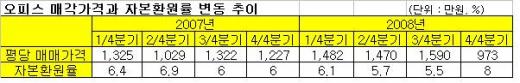 지난해 3분기까지 매각 수익률은 20% 이상이었지만 글로벌 금융위기로 실물자산 가치 하락으로 10% 초반까지 떨어졌다. 반면 매수자의 경우 3분기까지 5%대였던 자본환원률(연간 순임대수익을 거래가격으로 나눈 비율)이 매각가격 하락으로 4분기에 8%대로 치솟았다.
