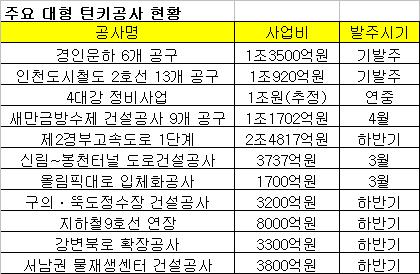 정부가 경기활성화를 위해 내세운 녹색뉴딜로 공공공사 발주물량이 급증하고 있기 때문이다. 새해 벽두부터 1조3500억원 규모의 경인운하 건설사업이 발주된 것을 시작으로 4대강 정비사업, 새만금방수제, 제2경부고속도로 등 초대형 턴키공사가 발주대기중이다.