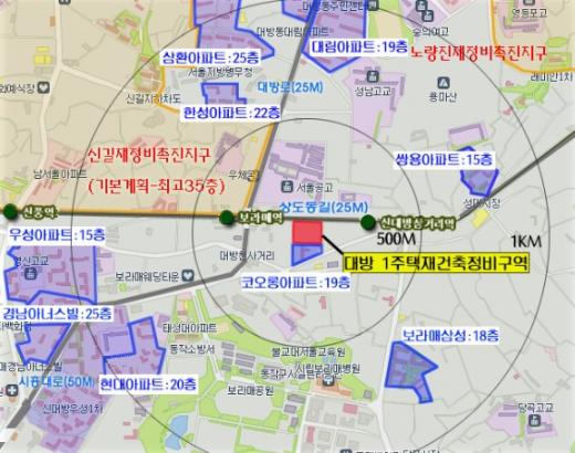 서울시는 25일 도시건축공동위원회를 열어 동작구 대방동 402-6번지 일대 1만1905㎡에 용적률 238% 이하, 건폐율 50% 이하를 적용받는 최고 16층짜리 아파트 6개동, 234가구를 건립하는 '대방1구역 정비구역 지정안'을 조건부로 가결했다고 26일 밝혔다.