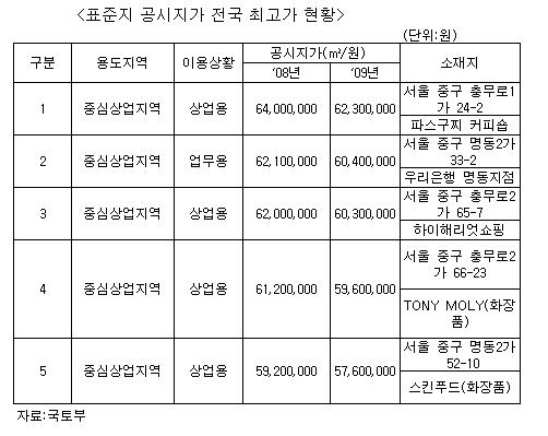 이어 중구 명동2가 33-2 '우리은행 명동지점'이 3.3㎡당 1억9932만원으로 비싼 토지 2위에 올랐으며 △중구 충무로2가 65-7 하이해리엇쇼핑(3.3㎡당 1억9899만원) △중구 충무로2가 66-23 토니몰리(1억9899만원) △중구 명동2가 52-10 스킨푸드(1억96680만원) 등이 3~5위를 차지했다.