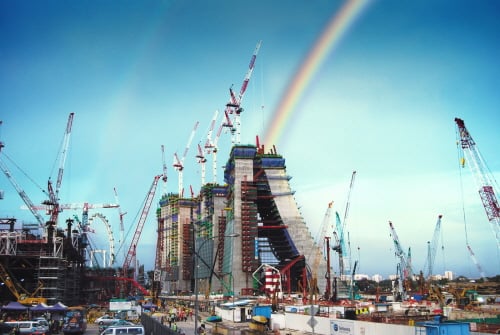 쌍용건설은 싱가포르에서 건설 중인 마리나 베이 샌즈 호텔의 52도 기울어진 동편 건물을 서편 건물과 들입자(入) 형태로 연결하는 데 성공했다고 밝혔습니다.