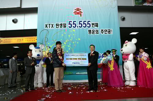 코레일은 1일 개통 5년을 맞아 5만5555번째 이용객을 선정했다. 주인공은 이날 오후 5시57분 서울역에 도착한 회사원 심익찬씨(31)다. 심씨에게는 KTX 5개월 특실 무료이용권이 주어진다.