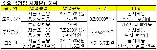 공기업별 공사채 발행계획은 토공 9조9000억원, 주공 7조8924억원, 코레일 3조7000억원 등 모두 21조4924억원에 달한다.