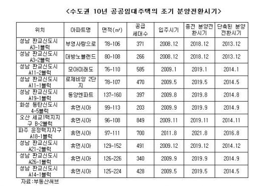 이밖에 화성 동탄신도시 4-5블록, 오산 세교지구 B-2블록도 2014년부터 분양전환이 가능해진다.