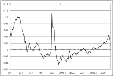 한편 같은 기간에 두 차례의 가격 상승이 있었다. 첫 번째는 1996년부터 외환위기 직전까지이며, 두 번째는 2000년부터 작년 상반기까지이다. 이 두 기간 동안 '회사채수익률-자본화율'은 -2%포인트 이하의 수준을 보였다. 따라서 회사채수익률에서 자본화율을 뺀 비율이 -2%포인트와 2%포인트의 중간에 해당하는 0%포인트 내외에 있을 경우, 대략적이나마 주택가격은 적정수준에 있다고 말할 수 있다.