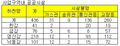 국토부는 용지보상과 병행해서 4대강 살리기 사업구간을 종ㆍ횡단하는 통신관, 가스ㆍ송유관, 교량 등의 지장물에 대한 이설 및 보강도 추진할 계획이다. 대상 시설물은 120여개로 예상되며 5월 말까지 세부조사 및 처리계획을 완료하고, 4대강 살리기 사업에 지장이 없도록 시설물 관리주체가 조치하기로 했다.