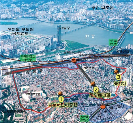 용산과 여의도의 배후지로 주목받는 노량진뉴타운이 녹색도시로 조성된다. 노량진역과 장승배기역 중간에는 고층 빌딩의 타운센터를 배치, 상업업무 중심축으로 육성한다.