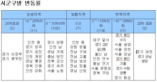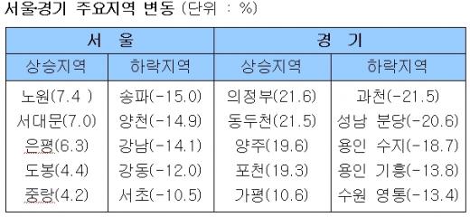 반면 의정부(21.6%) 동두천(21.5%) 인천 동구(19.8%) 등은 경전철 건설, 재개발재건축 등 개발호재로 인해 가격상승 기대감이 높아지면서 공동주택가격이 치솟았다.