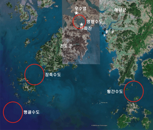 전남 해남과 진도 사이에 위치한 좁은 바닷길, '바다가 우는 길목'이라는 뜻의 울돌목. 울돌목의 물이 닿는 바위나 부표 등에는 하얀 물보라가 인다.