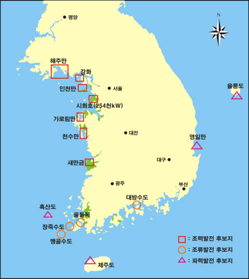 조력발전의 경우 내년 하반기 시화 조력발전(25만4000kW급)이 준공예정이고, 가로림만과 해주만, 인천만, 천수만, 새만금 등도 경제성을 갖춘 것으로 평가받고 있다. 파력은 흑산도, 제주도, 영일만, 을릉도 등이 유력 후보지로 거론되고 있다.