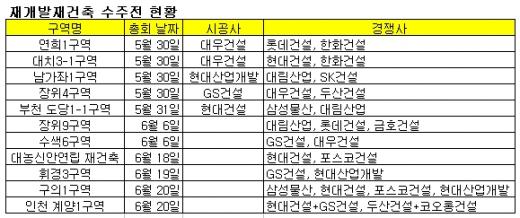 지난달 30일과 31일 서울과 경기 부천에선 총 5건의 재개발·재건축사업 시공사 선정 총회가 열렸다. 상위 10대 대형건설사 대부분이 참여한 이들 사업장의 시공사 선정에서 업체간 희비가 엇갈렸다.