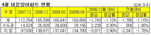국토해양부는 5일 지난 4월 기준 전국 미분양아파트는 16만3856가구로 사상 최대 규모였던 3월 16만5641가구에 비해 1785가구가 감소했다고 밝혔다. 수도권은 2만9156가구로 전월 2만8600가구대비 556가구가 증가했고, 지방은 13만4700가구로 전월 13만7041가구에 비해 2341가구가 감소했다.