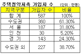 국토해양부는 지난달 6일 첫 출시된 주택청약종합저축 가입자수가 같은 달 말 현재 587만명에 달한다고 14일 밝혔다. 지역별로는 수도권이 360만명으로 61.3%를 차지했고 지방은 전체 가입자의 38.7%인 227만명이 통장을 만들었다. 수도권에선 서울이 187만명이며 경기가 143만명이다.