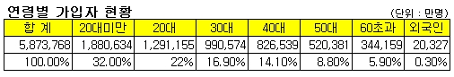 연령별로는 20세 미만 미성년자 가입자가 188만명으로 32%를 차지했다. 외국인도 2만여명이 가입했다. 연령대별로는 내집마련을 위한 예비청약자층인 20대와 30대가 각각 129만명(22%)과 99만명(17%)에 달했다. 국토부는 6월도 보름 가량 지난 시점을 감안할 때 가입자수가 600만명을 훌쩍 넘었을 것으로 전망했다.