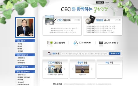 블로그에는 정 사장의 현장중시경영을 엿볼 수 있는 'CEO 현장경영' 코너를 비롯해 임직원간의 커뮤니케이션 활성화를 위한 '열린경영 참여하기' 등 다양한 콘텐츠가 갖춰졌다. 또 임직원들이 CEO에게 직접 의견을 개진할 수 있도록 토론방도 열었다. 임직원들은 사내 인트라넷인 드림피아를 통해 바로 접속할 수 있다.