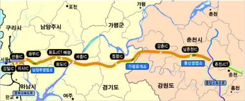 서울 강동구 하일동에서 강원도 춘천시 동산면 조양리를 연결하는 서울춘천고속도로는 총연장이 61.4km다. 강일 IC를 시점으로 경기 화도IC까지 14.5km 구간은 왕복 6~8차로며, 화도IC~춘천JCT 46.9km 구간은 왕복 4차로다. 교량 103개소, 터널 41개소, 출입시설 9개소, 영업소 9개소 등이 건설되며 휴게소는 상하행선에 각각 1곳씩 조성된다.