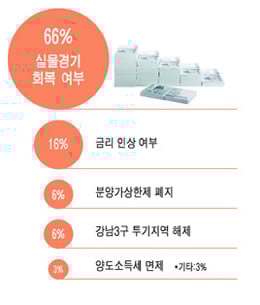 하반기 부동산시장의 변수를 묻는 질문에는 응답자의 66%가 '실물 경기 회복'을 꼽았다. 부동산시장의 투자 수요는 금융시장 등 외부환경 변화에 주로 영향을 받지만 실수요는 경기 회복에 민감하게 반응하기 때문이다. '금리 인상'이라고 답한 응답자도 16%에 달했다.