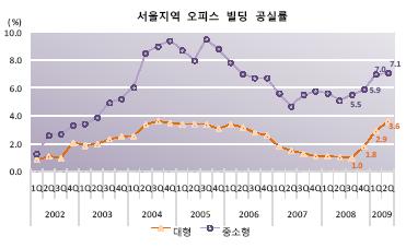 서울 대형 오피스 공실률이 3.6%를 기록한 것은 2004년 3/4분기 3.6% 이후 5년 만으로, 기업들이 사업을 동결하거나 축소하면서 임차면적이 급감한 것이 원인인 것으로 분석됐다.