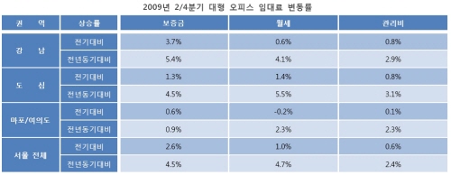 이 회사 김태호 시장분석팀장은 "공실률 급증에도 불구하고 임대료가 아직 상승세를 보이는 것은 프라임급 빌딩을 중심으로 임대료를 인상하고 있는데다 평균 임대료가 낮아질 정도까지 임대료를 인하하는 빌딩이 많지 않기 때문"이라고 말했다.