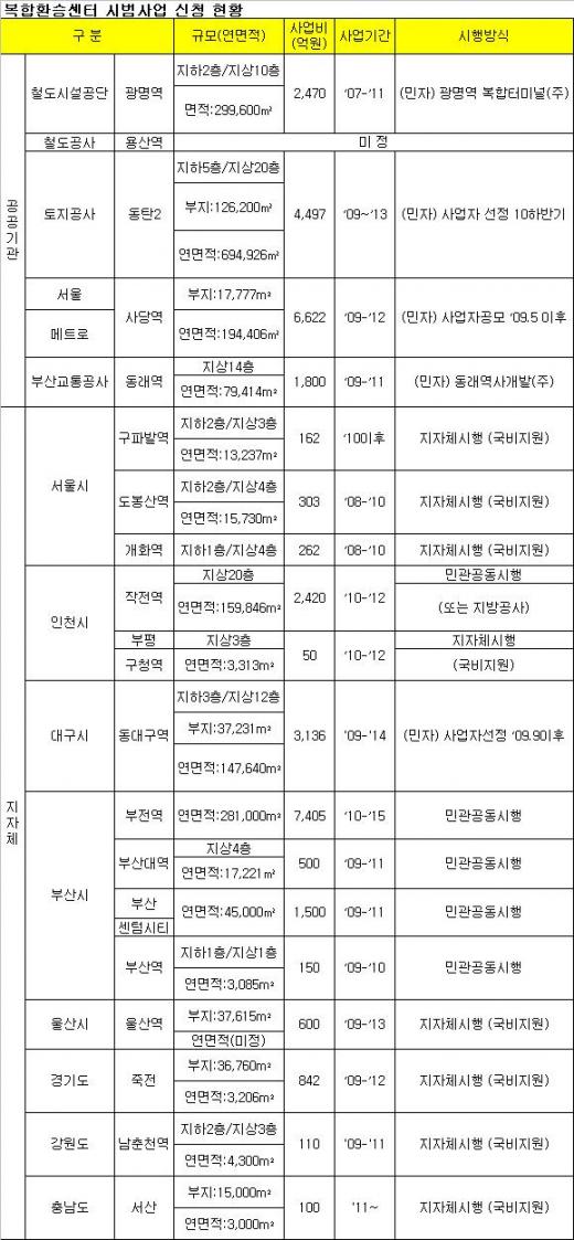 이중 동대구역, 광명역, 동탄2신도시, 사당역, 동래역 등 5곳이 시범사업으로 우선 추진된다. 국토부는 2012년까지 10개소, 2020년까지 40여개소의 복합환승센터를 개발할 계획이다.