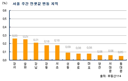 강서(0.26%) 송파(0.25%) 강남(0.21%) 서초(0.18%) 강동구(0.18%) 등이 상승폭이 큰 편이다. 성동(0.09%) 종로(0.08%) 마포(0.08%) 양천구(0.06%) 등이 올랐다.