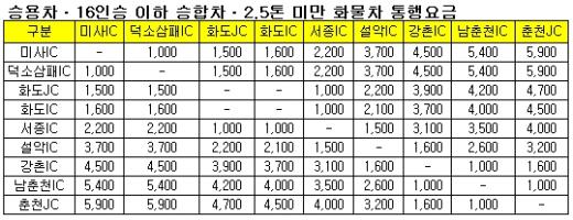 통행료는 전 구간 61.4㎞를 이용할 경우 5900원이며 10㎞까지는 최소 요금 1000원으로 책정됐다. 이와 관련, 춘천시는 자체적으로 지역주민들에게 전 구간 이용시 700원을 할인하는 제도를 시행할 예정이다.