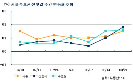 22일 부동산정보업체 부동산114에 따르면 이번주(8월15~21일) 서울 전셋값은 0.15% 올라 지난주(0.11%)보다 오름폭이 커졌다. 강북구, 은평구, 종로구 세 곳만 보합세를 보였고 나머지 구는 일제히 올랐다. 한주만에 0.2%~0.3%대 상승률 보인 구도 9곳이나 됐다.