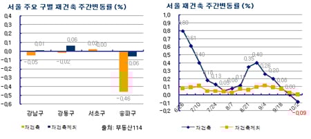 재건축시장에서도 송파구가 0.46% 하락, 가장 큰 폭으로 떨어졌다. 강남구(0.05%)와 강동구(0.02%)도 하락했다. 서초구 재건축 아파트값만 0.02% 올랐다. 9월들어 자금출처조사와 대출규제강화 영향으로 하향 조정된 가격에 거래가 이뤄졌다. 강동구 고덕주공4단지 52㎡는 1000만원 떨어졌다.
