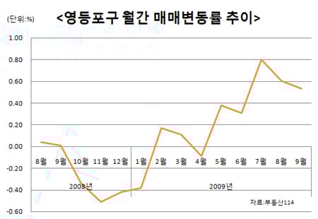 6일 부동산정보업체 부동산114에 따르면 영등포구 아파트 매매가는 올 8월 0.60% 상승률을 기록한 이후 지난달에도 0.53% 오르는 등 큰 폭의 오름세를 보였다. DTI 규제 확대 후에도 상승세를 유지하고 있다.