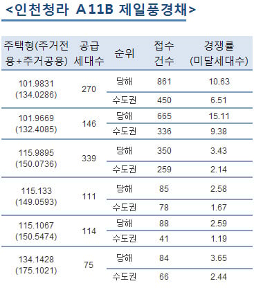 △101.97㎡는 수도권에서도 14.2대 1의 높은 경쟁률을 보였다. △101.99㎡는 인천 11.7대1, 수도권 7.3대1이었고 △121.73㎡sms 인천 2.9대1, 수도권 2.1대1로 나타났다.