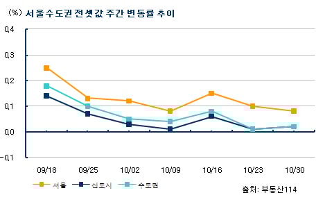 31일 부동산정보업체 부동산114에 따르면 이번 주(10월24~30일) 서울 아파트 전세가는 0.08% 올랐다. 추석연휴 전후보다는 상승폭이 줄었지만 국지적으로 물건이 부족한 곳은 여전히 오름세를 보였다.