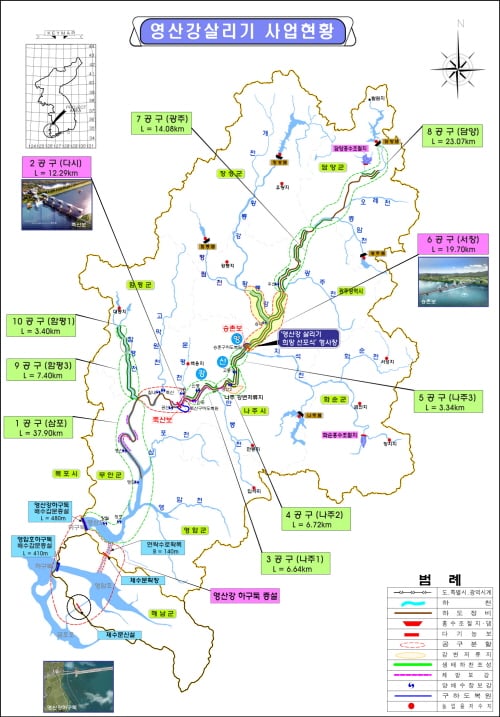 이날 기공식을 갖는 영산강 살리기 사업은 승촌보·죽산보 등 보 2개를 설치하고 준설(0.3억㎥)을 통해 풍부한 유량(1.1억㎥)을 확보하며 환경기초시설을 확충해 수질을 개선한다. 희망선포식 행사가 개최되는 영산강 6공구는 생명의 씨앗을 형상화한 승촌보가 설치돼 영산호에서 출발하는 황포돛배가 드나드는 지역의 랜드마크 역할이 기대되고 있다.