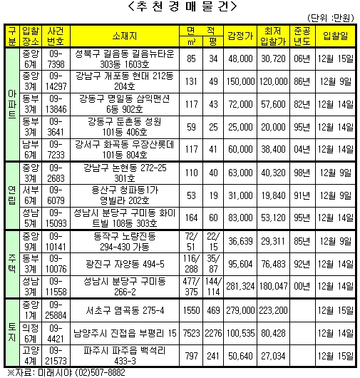 ◇성동구 옥수동 전용 148㎡ 아파트=서울 성동구 옥수동 428 극동아파트 1동 907호가 경매물건으로 나왔다. 이 아파트는 총 900가구 규모로 1987년 준공됐다. 해당물건은 15층 건물의 9층으로 방이 5개다. 지하철 3호선 옥수역이 걸어서 8분 정도 걸린다. 옥정초·중, 장충고 등 학교가 가깝다. 현대백화점, 서울백병원, 응봉공원 등 편의시설도 잘 갖춰져 있다. 최초감정가 9억5000만원에서 2회 유찰돼 이번 경매 최저매각가는 6억800만원이다. 매각은 오는 14일 서울동부지방법원 경매3계. 사건번호 09-7483.