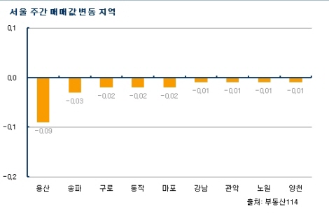 자치구별로는 △용산(-0.09%) △송파(-0.03%) △동작(-0.02%) △마포(-0.02%) △구로(-0.02%) 등이 하락했다. 동대문·서대문·서초·영등포 등은 0.01% 올랐다.