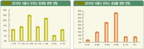서울 오피스시장의 임대료 수준을 묻는 질문에는 하락(37%)하거나 보합(49%)을 보일 것이란 예측이 상승(14%)할 것이란 전망보다 우세했으며 하락으로 내다본 응답자의 39%가 3~5%의 임대료 하락을 예상했다.
