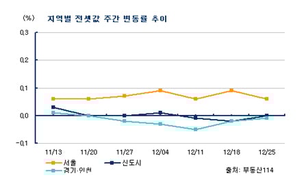 경기·인천(-0.01%)의 경우 상당수 지역이 제자리걸음을 한 가운데 광명(-0.13%)가 7주 연속 하락했다. 11월 말에 입주를 시작한 철산동 래미안자이 중대형이 전세수요가 적어 500만원 떨어졌고 인접한 브라운스톤광명, 브라운스톤광명2차도 250만원 하락했다.