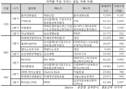 권역별로는 ING타워, 데이콤빌딩, 미래에셋벤처타워 등 대형과 중소형 오피스 거래가 활발했던 강남권역(KBD)이 15건, 1조221억원이다. 흥국생명빌딩과 극동빌딩 등 대형 오피스 빌딩이 거래된 도심권역(CDB)이 8건에 1조2346억원이다. 여의도마포권역(YBD)에서는 파이낸스센터 등 3건, 3423억원이 거래됐다.