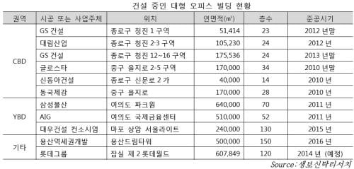한편 생보부동산신탁은 서울 신규 오피스 공급 예정물량을 2010년 82만8900㎡, 2011년 111만1100㎡ 등으로 전망했다. 특히 내년 도심권역에서 50만㎡, 2011년 여의도권역에서 91만㎡ 등이 집중 공급될 예정이어서 임차수요가 뒷받침되지 않는다면 공실률 상승이 불가피할 것으로 예측했다.